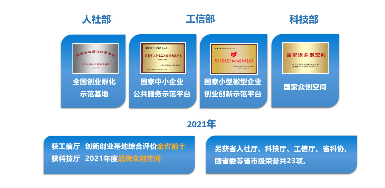 山東省青年創業孵化基地、山東省中小企業公共服務示范平臺、山東省創業孵化示范基地、山東省小微企業創新創業示范基地、省級眾創空間(周村區創業孵化中心)、山東省創客之家、山東省2019年全國科普日優秀活動、2021年度山東省小型微型企業創業創新示范基地綜合評價前十、山東省五四紅旗團支部、省級專家服務基地。